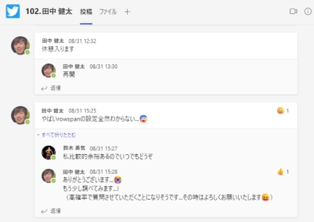 共通のコミュニケーションツールとしてMicrosoft Teamsを導入しています。仕事上のコミュニケーションだけでなく、美味しいお店やお得情報、面白ネタなども共有されています。