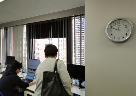 社内勤務のメンバーは、その日の都合に合わせて8時から10時の間で始業時間を選択できます。通勤負担の低減や、平日のプライベート時間を有効に利用できると好評です。